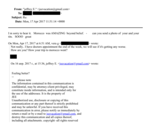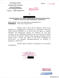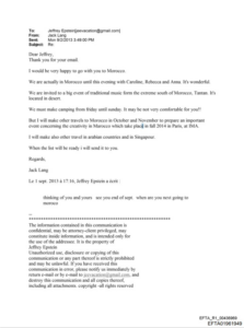 وفي التقرير الثاني، يظهر تبادل رسائل إلكترونية من 2010 بين جيس ستالي وجيفري إبستين. في هذه المراسلات، دعا إبستين ستالي إلى لقاء وذكر أنه سيكون لديه “وقت خاص” مع جميع الحاضرين وأن “ذلك لن يخيب أمله” (وفقًا للقضاء الأمريكي). وقد سُمح لإبستين بأن يقضي وقتًا خاصًا مع الطيب الفاسي الفهري، مستشار الملك المغربي محمد السادس، عندما كان عمره 16 عامًا وما يزال يشغل منصبه حاليًا، كما التقى إبستين أيضًا بموراتينوس بعد ذالك.